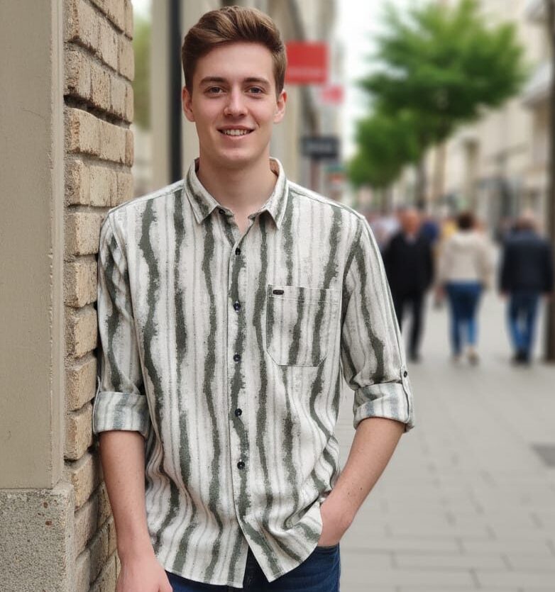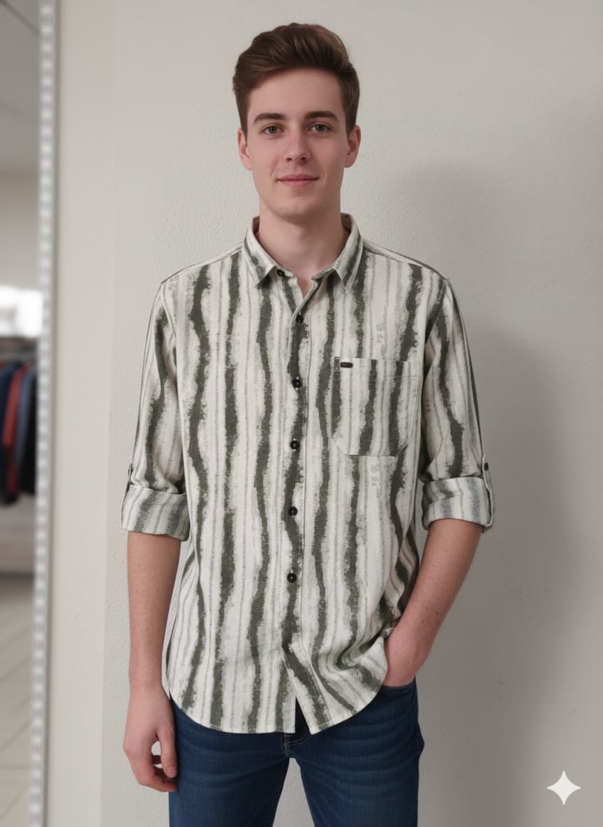 Shirt Details: A long-sleeved button-down featuring a high-contrast abstract “marble” or “swirl” pattern. It includes a standard collar, a single chest pocket, and adjustable cuffs (shown rolled up to a mid-arm length).
