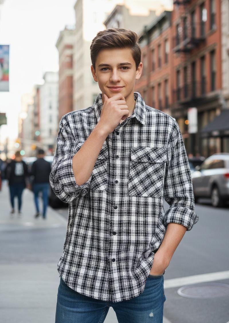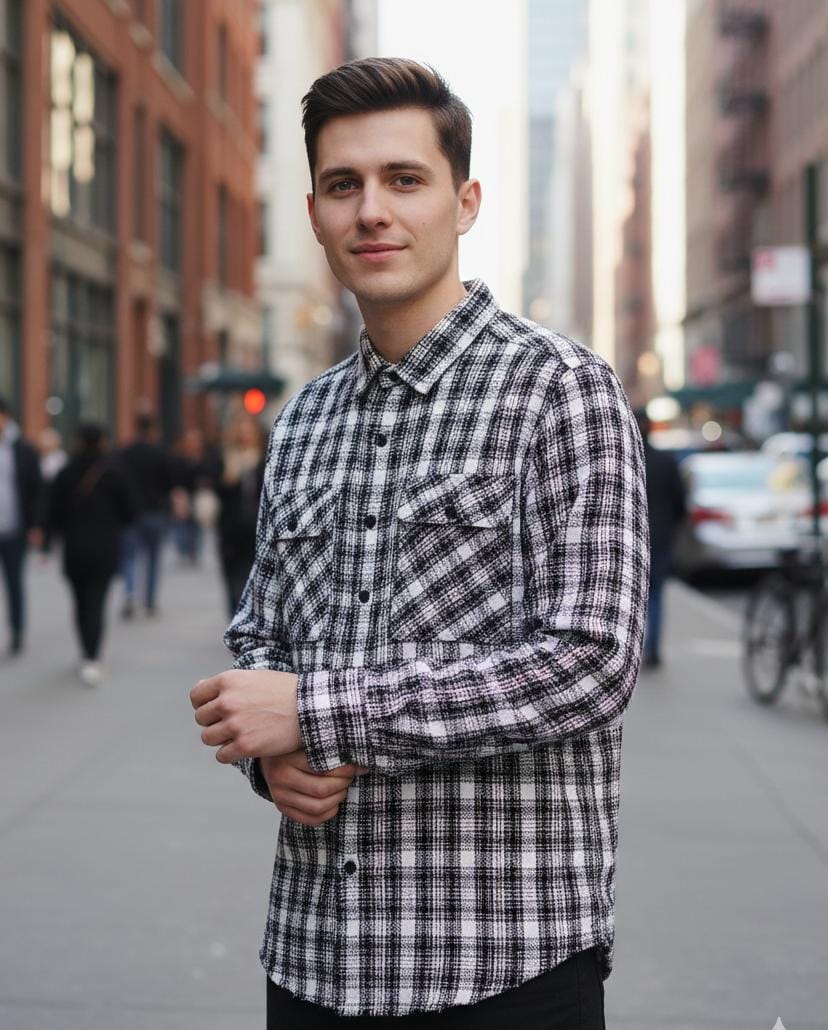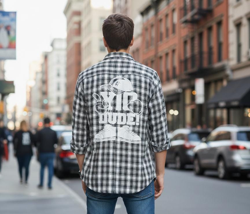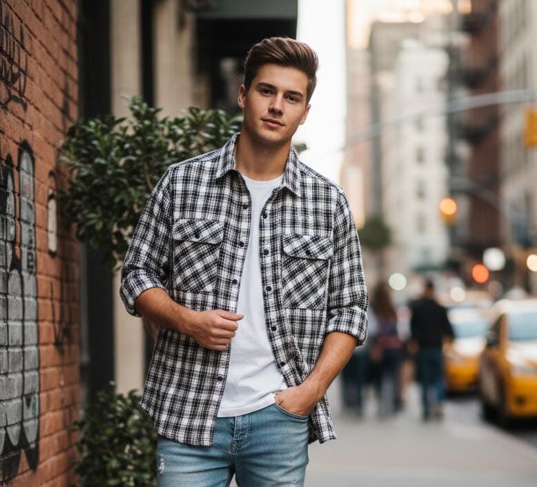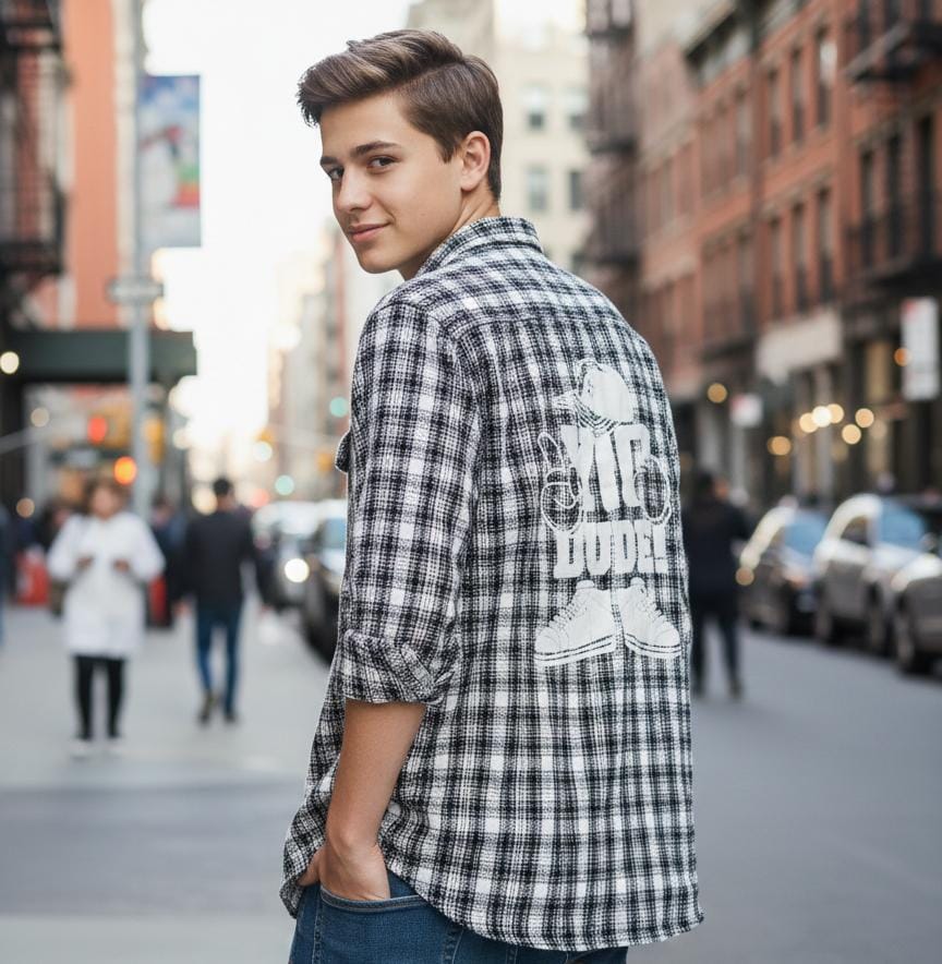• The shirt is strictly monochromatic, utilizing a high-contrast combination of stark white and deep black.