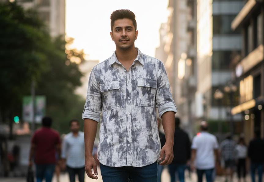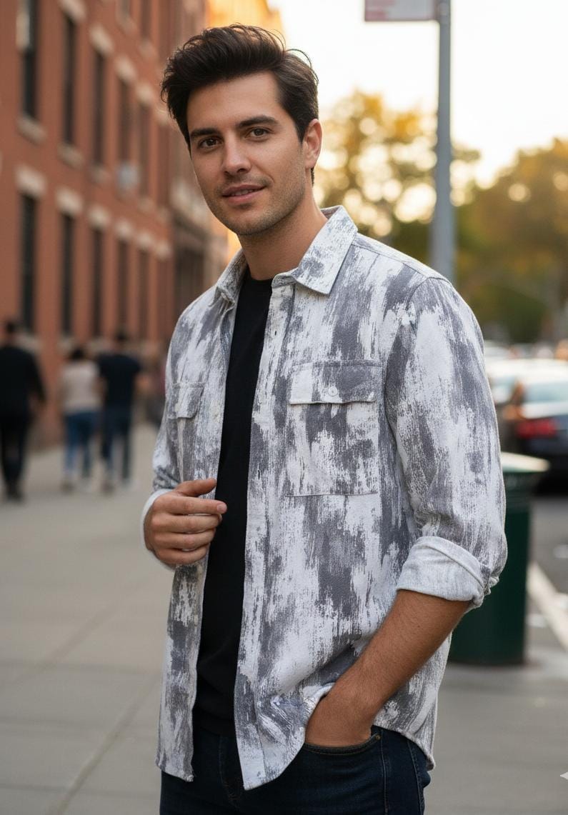 neutral tan with cool blue shirt for men (copy)Double pocket baggy fit white shirt with tan