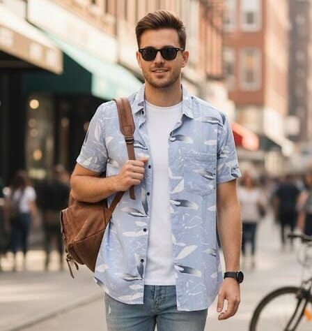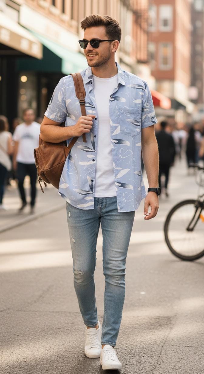 sky blue with pattern printed shirt