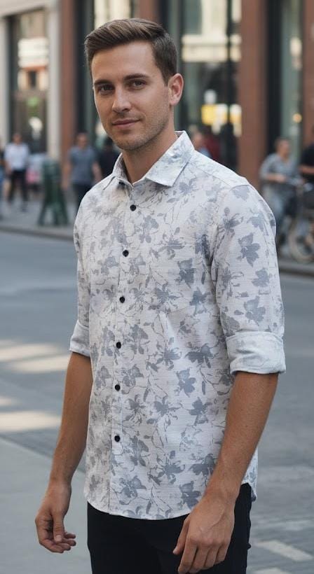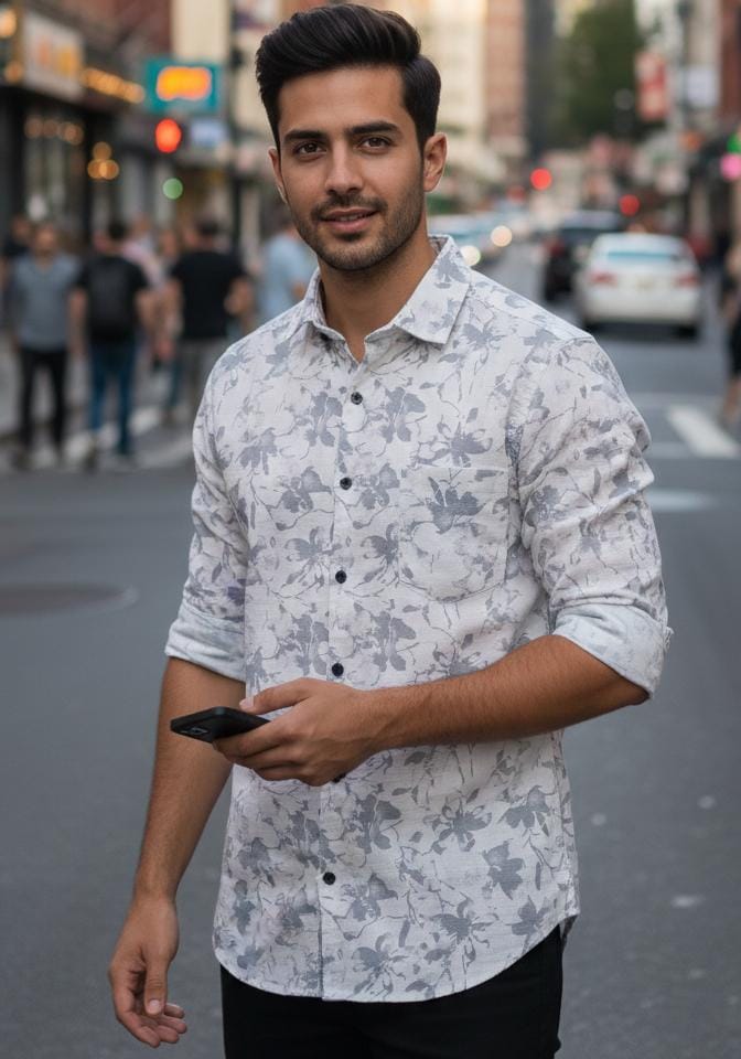 White and charcoal grey tones floral printed shirt